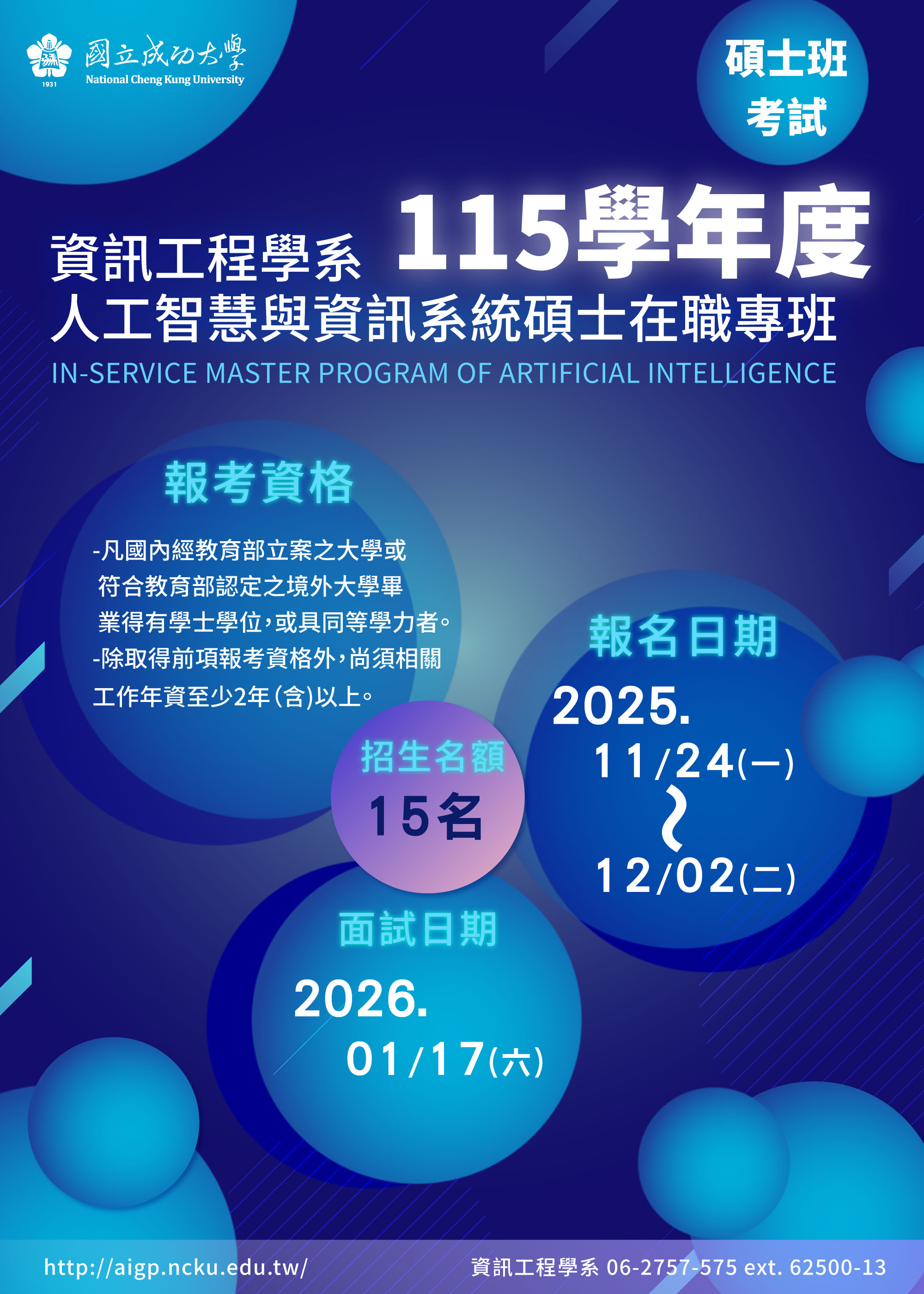相關在職專班招生資訊可至在職專班網頁查看:https://aigp.ncku.edu.tw/index.php